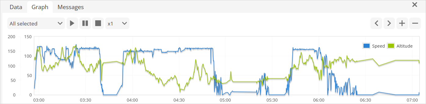 The history graph displays the results of various configured sensors for the selected GPS tracking device such as speed, altitude, ignition, fuel level, temperature and others, over a specified period of time. This allows users to visualize and analyze the sensor readings and track changes in these readings over time.