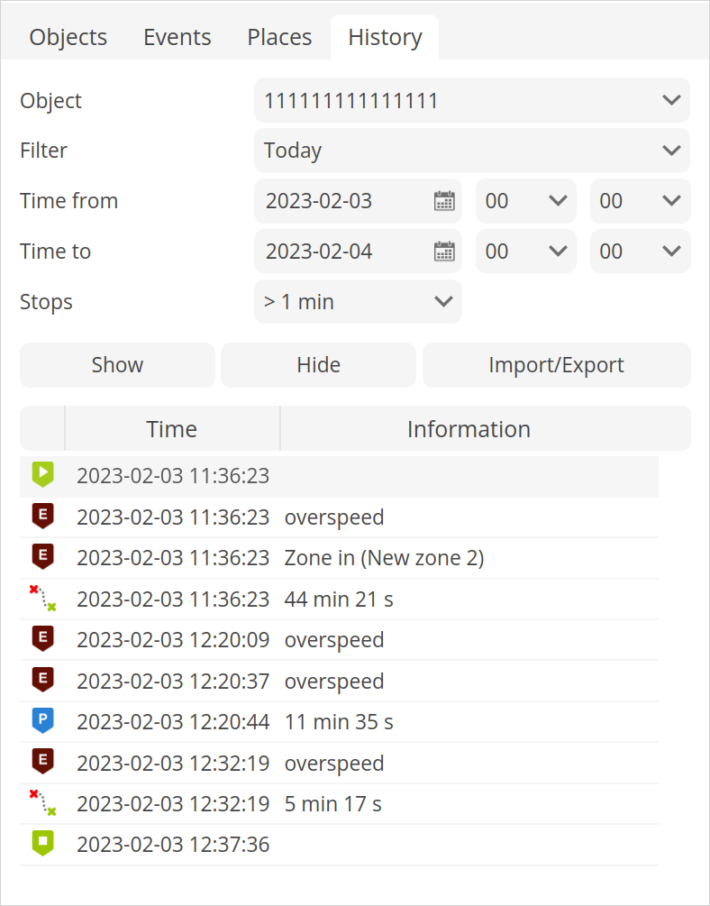 The History section provides a comprehensive overview of all relevant information pertaining to objects, including route details, stop locations, addresses, time schedules, zones, and the capability to generate short reports.