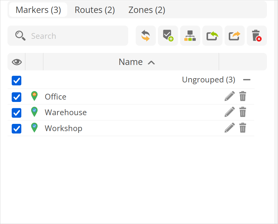 Markers provide a quick and efficient way to mark points of interest and destinations. Additionally, it allows for the generation of reports when an object has entered or left the vicinity of the marker.