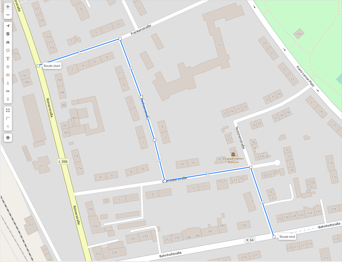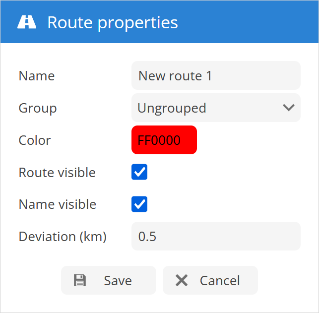 To add a new route to the map, press the icon in the routes tab. Route properties window will appear.