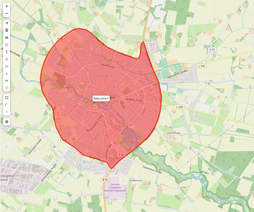 To add a new zone to the map, press the icon in the zones tab. Zone properties window will appear.