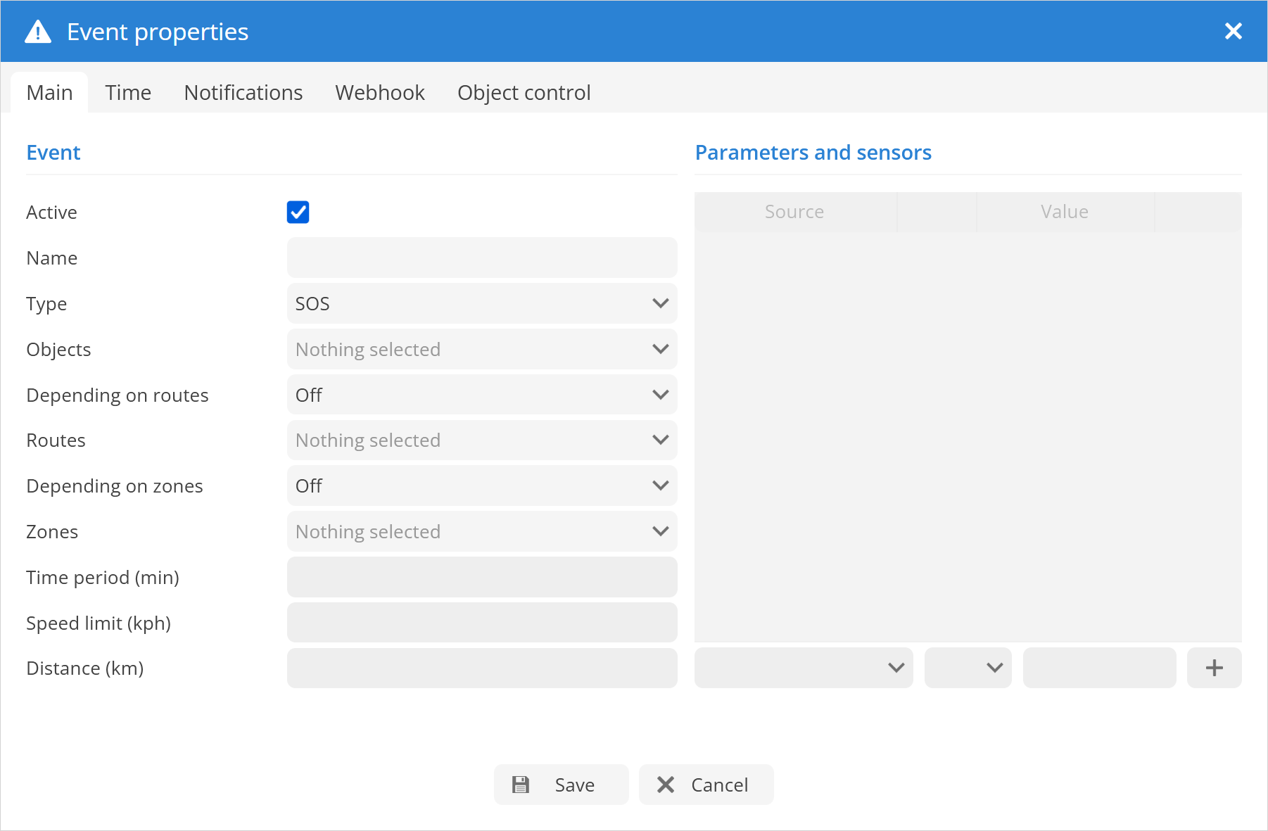 After selecting the Event type Parameter or Sensor, the "Parameters and Sensors" table becomes active.