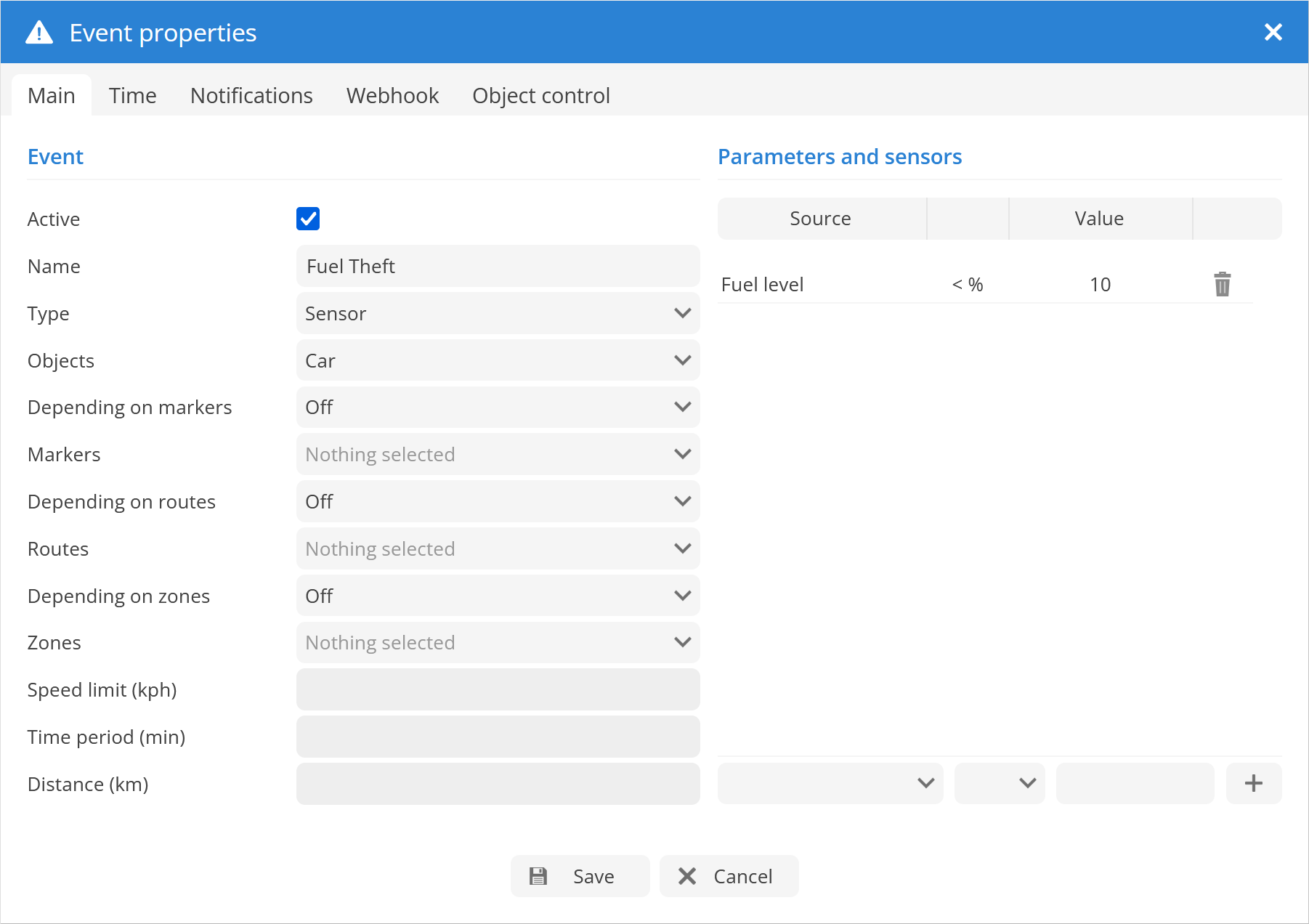 The example above displays the "Fuel theft" event, as the source "Fuel level" sensor, is selected.