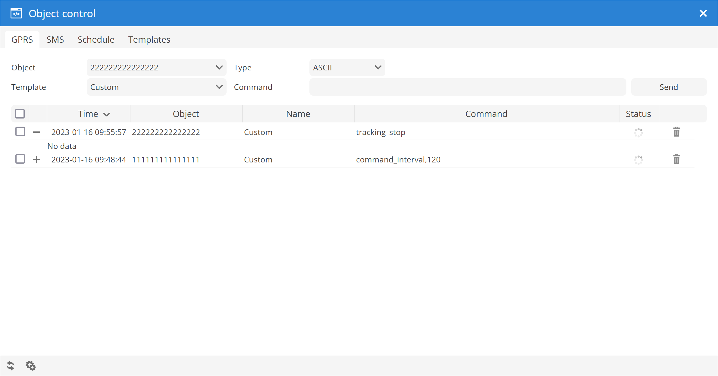 In this section you can send GPRS commands to the tracking devices or smartphones with GPS Tracker application installed to perform certain actions.