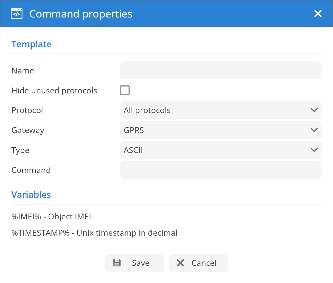 Gateway - specifies the way in which the command is sent to the tracking device: GPRS or SMS.