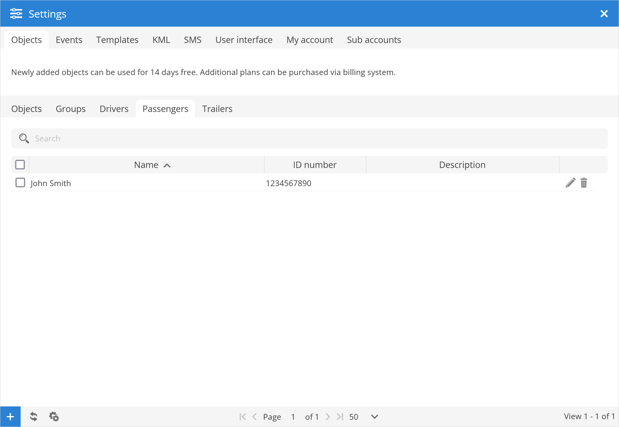 This section allows adding of passengers which can be detected with RFID/iButton. The passengers section purpose is to collect information about passengers. Driver information can be seen in the object details panel (note: object details panel only appears if the Objects, Events, or History tab is selected in the left panel.). Passenger name is available in reports. To use this feature Passenger assign sensor must be configured.