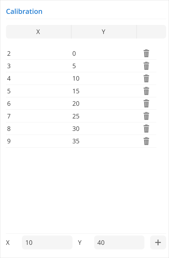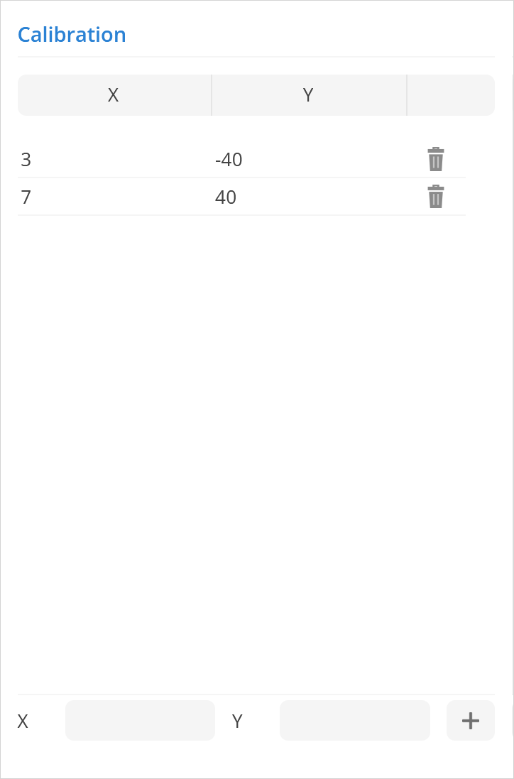 This section can be used with Fuel level, Temperature and Custom sensor type. Calibration allows you to set precise parameters of the sensor. Widely used to calculate fuel tank readings or convert sensor voltage to temperature values.