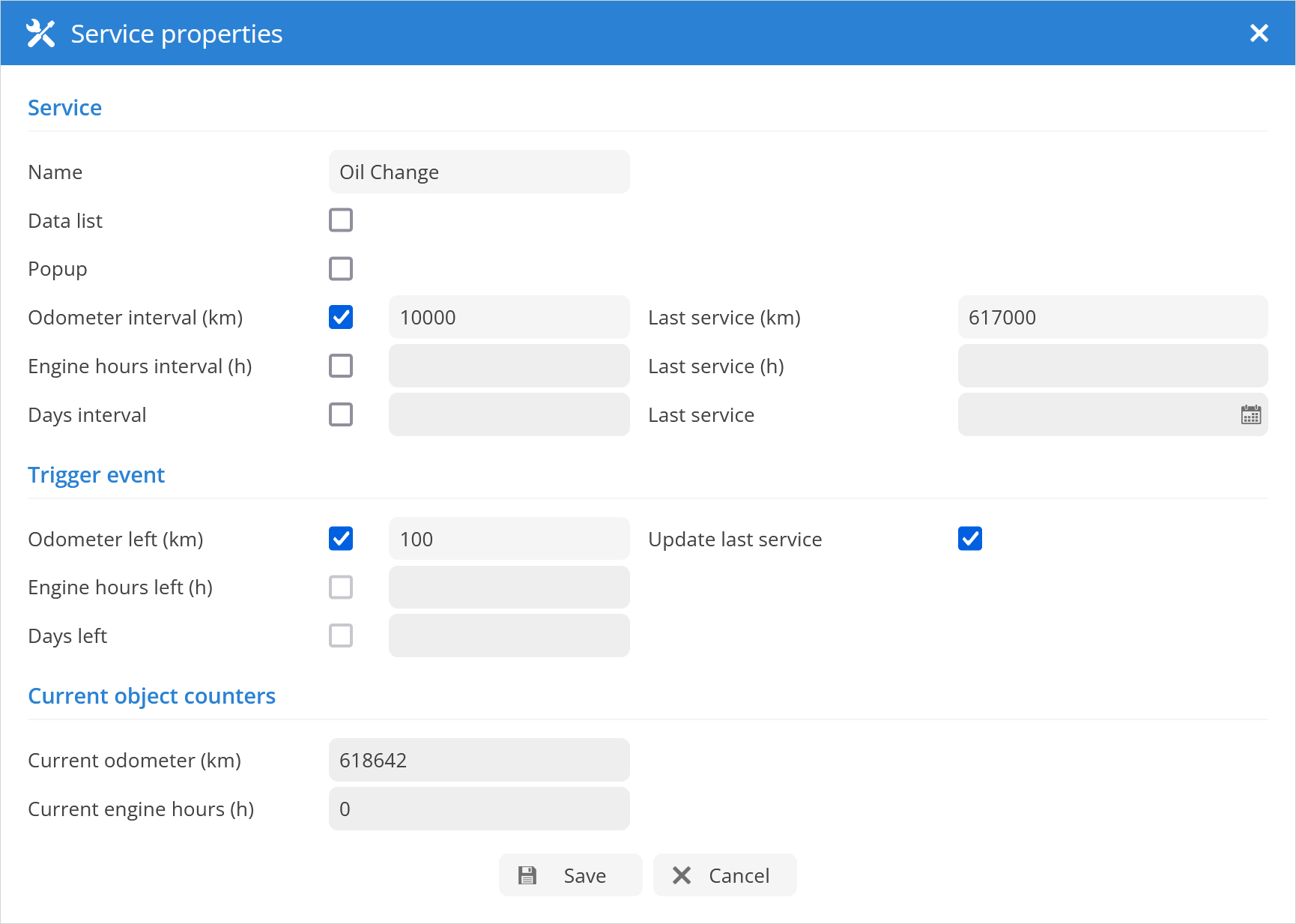Update last service - automatically updates the information by restarting the interval for the odometer, engine hours or days.