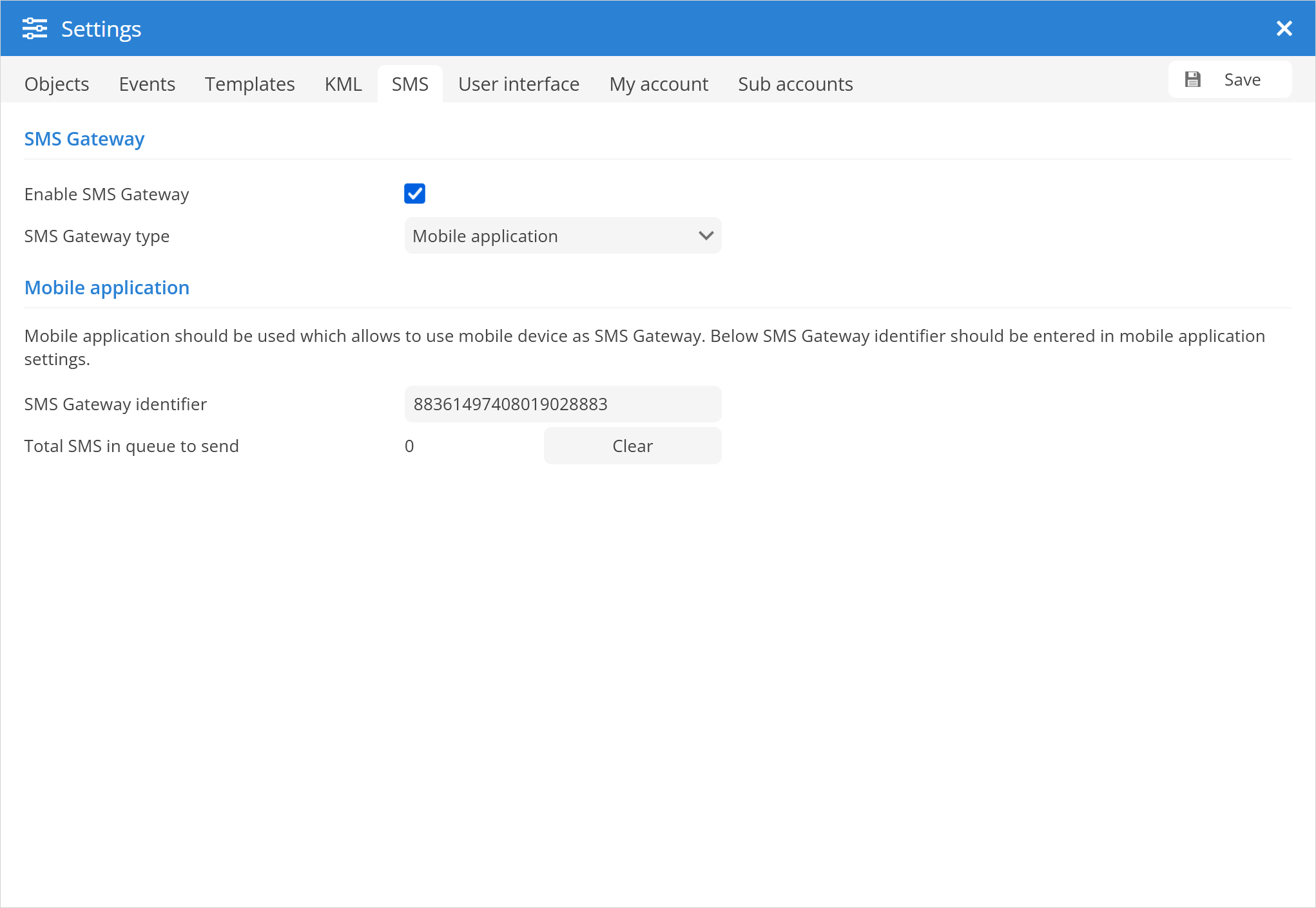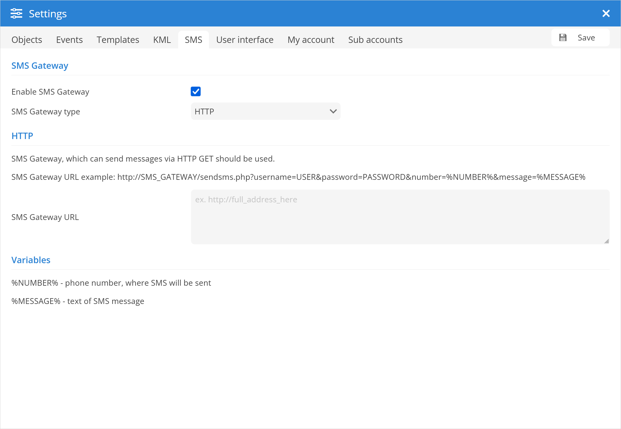 In this section, users can configure their SMS gateway, which is an important component for sending event notifications and commands to tracking devices.