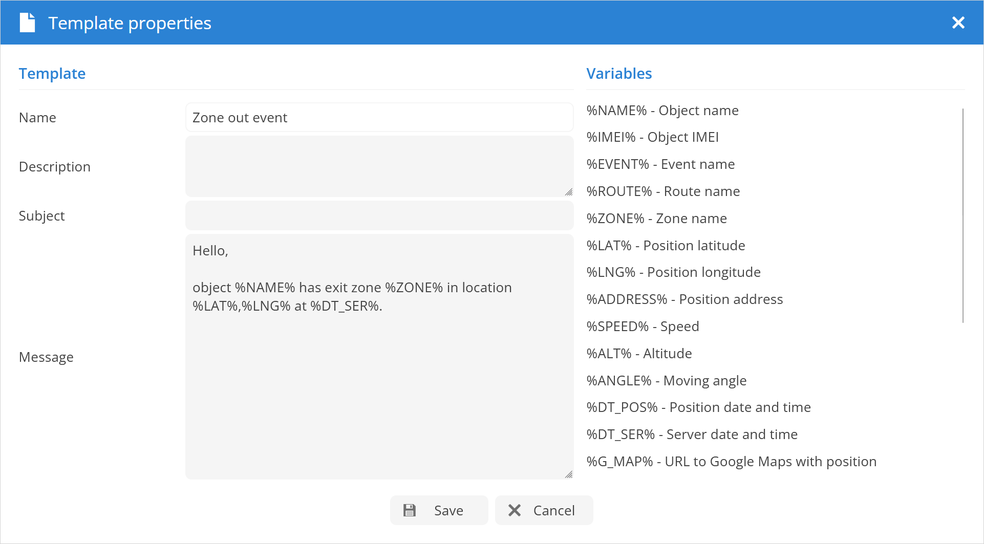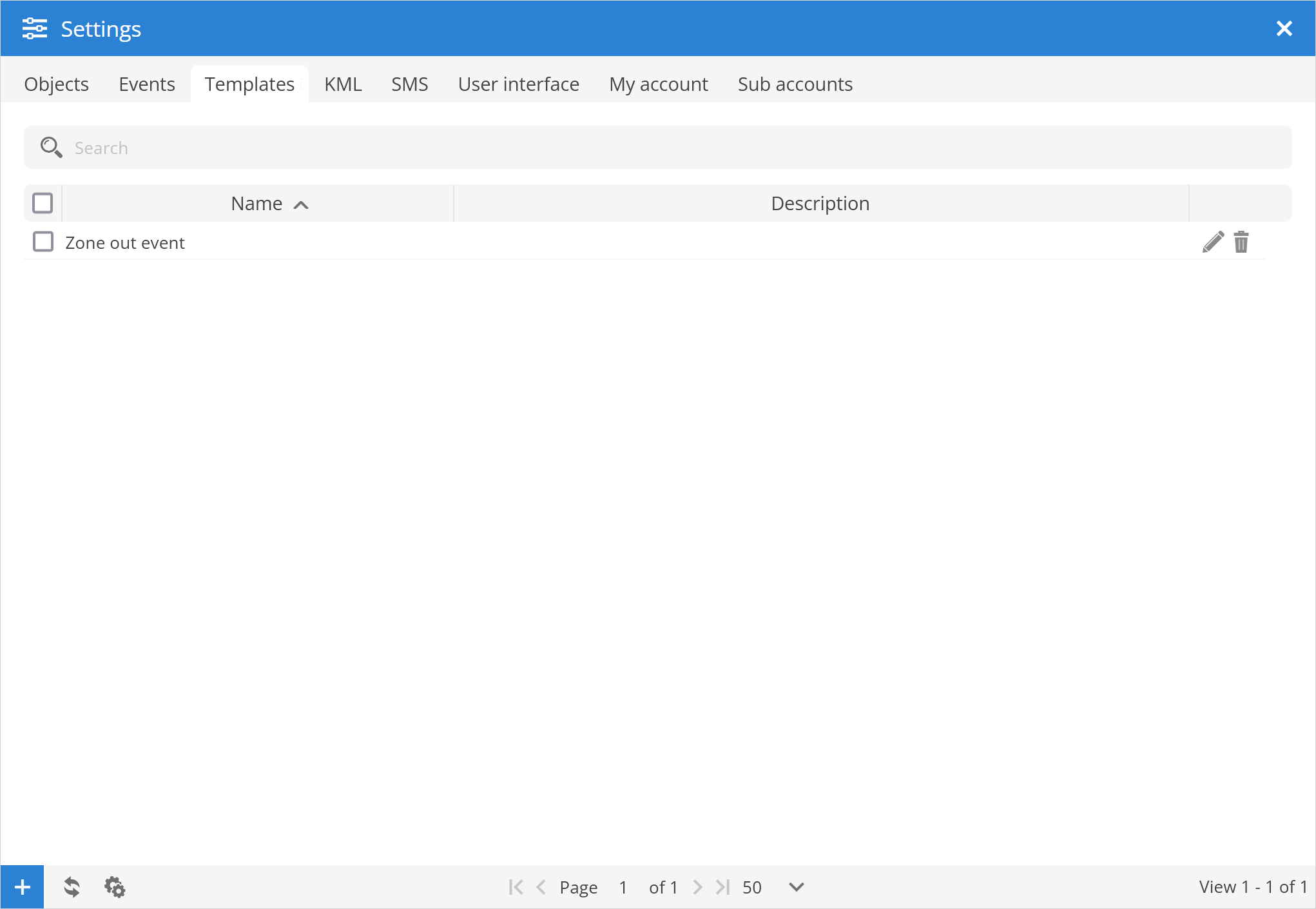 Templates section allows to create, edit, import, export and delete templates for Events notifications (E-mail and SMS).