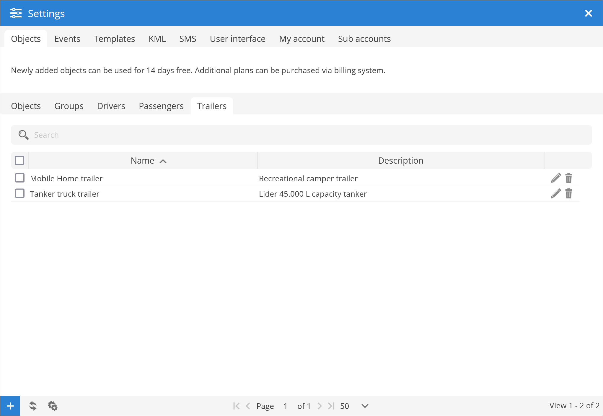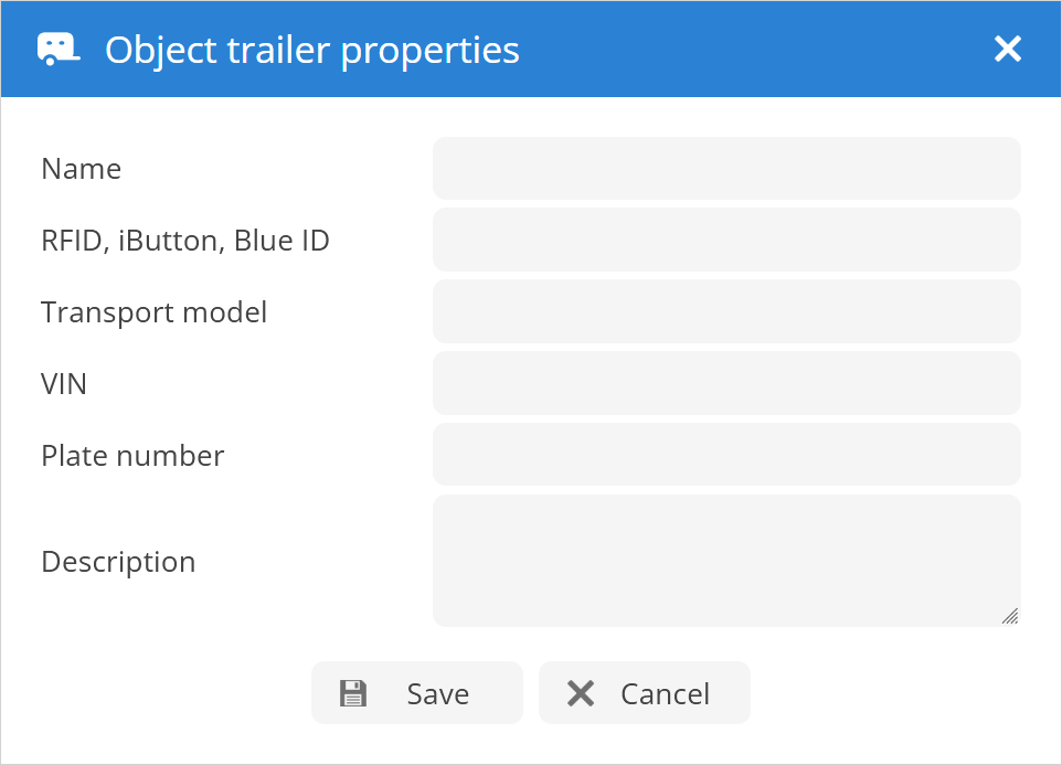 This section allows to add trailers and assign them to object. Trailers section purpose is to identify and collect information about trailer changes. Trailer information can be seen in object details panel (note: object details panel only appears if Objects, Events or History tab is selected in left panel.). Trailer name is available in reports. GPS device must be configured with iButton or RFID device.